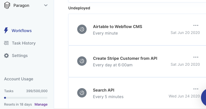 Under the Account Usage section of your dashboard, you can see how many tasks your workflows have used in your current billing cycle, and how many days you have left till your task usage resets. You can view a step-by-step breakdown of your workflows in your Task History.