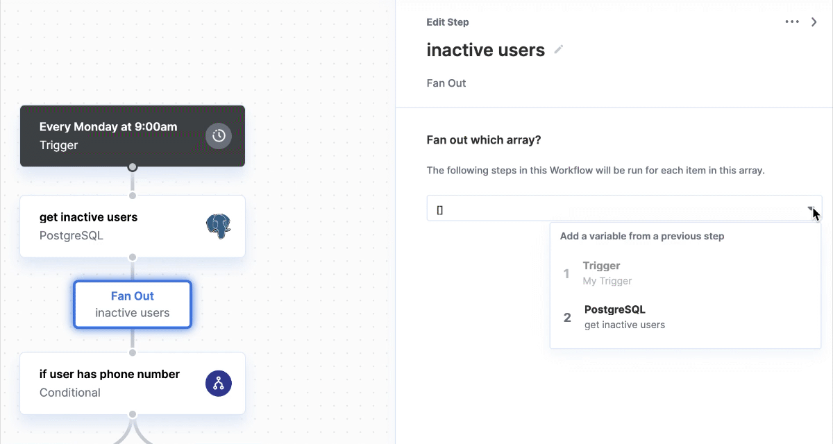 Fan Out allows you to run the same sequence of steps over each object in an array (or list) of objects. For example, you might want to query a segment of users from your database and send each user a message. To do this, you could use a PostgreSQL step to query your users, then a Fan Out step to iterate over each user, followed by a Sendgrid step to send each user an email. To add a Fan Out to your workflow, click the ”+” button in your workflow canvas and choose Fan Out from the sidebar. Then, click the dropdown button under “Fan out which array?” to invoke the variable menu and choose the array you want to fan out.