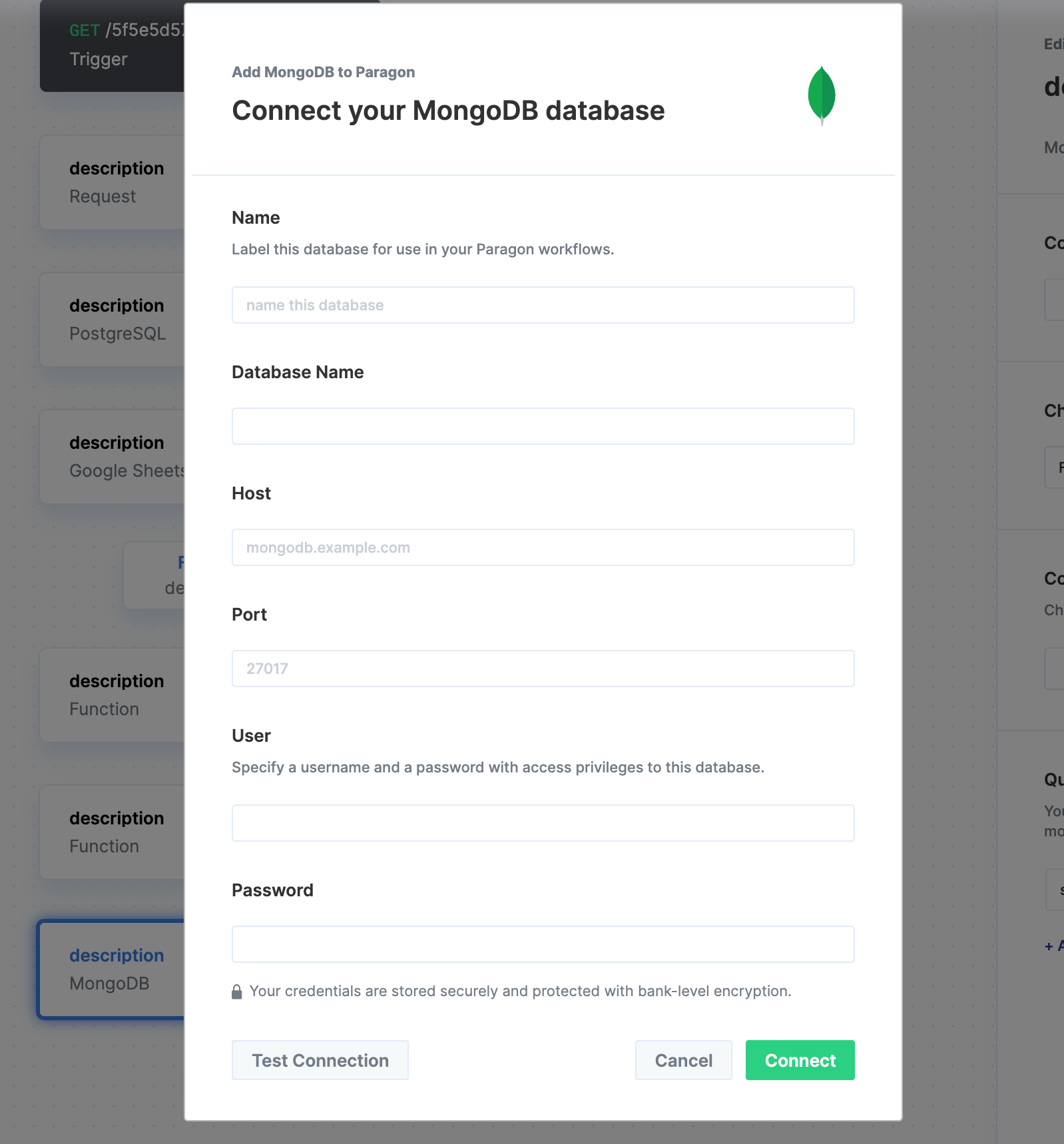 To add MongoDB to Paragon, click the ”+” button in the workflow canvas and choose the MongoDB from the sidebar. Under Connect to a MongoDB account, choose “Add new account for MongoDB” and enter your database credentials. We recommend setting up separate accounts for read and write access to make it harder to accidentally cause unwanted changes to your database.