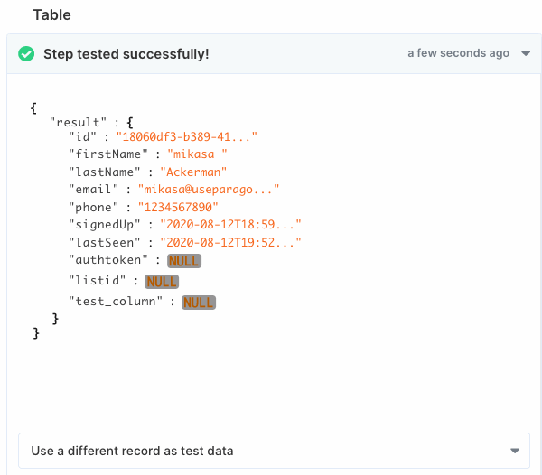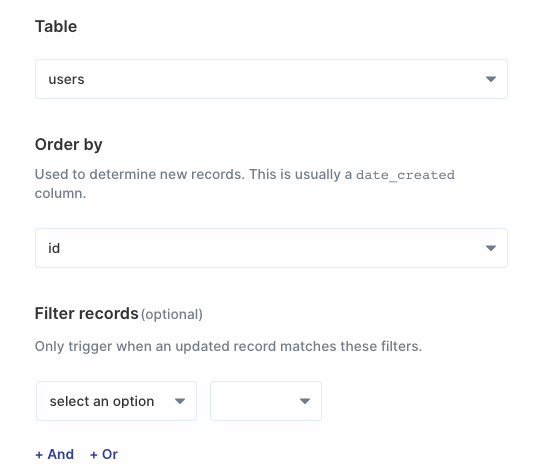 With the PostgreSQL trigger, Paragon checks for new data from your trigger every minute in order to start your workflow. Your workflow runs for each record meeting the trigger criteria. For example, five new records in your database with a “new record created” action would run your workflow five separate times, each with information from the corresponding record. The PostgreSQL trigger provides the following trigger options:- New record created