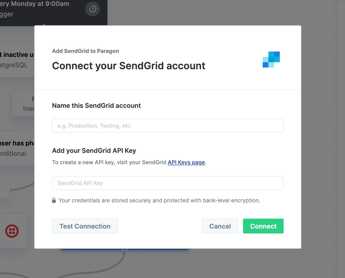 To add SendGrid to Paragon, click the ”+” button in the workflow canvas and choose Sendgrid from the sidebar. Under Connect your SendGrid account, choose “Add new account for SendGrid” and enter your SendGrid API key.