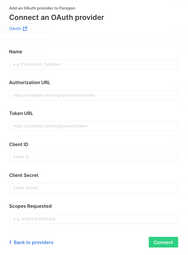 Paragon’s OAuth interface allows you to connect any OAuth provider in around 5 minutes.Setup Guide