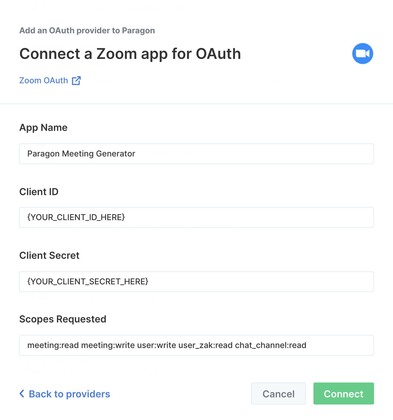 - Client ID: Found under App Credentials > Client ID on your Zoom App page.