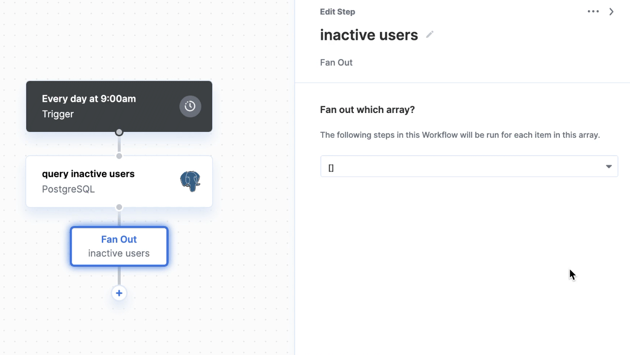 Next, we’ll want to Fan Out the users from our database query, so we can iterate over each user and send them an email. Add a Fan Out step to your workflow and choose the array of users from PostgreSQL database query. Now, any steps added under the Fan Out step will be performed for each user.